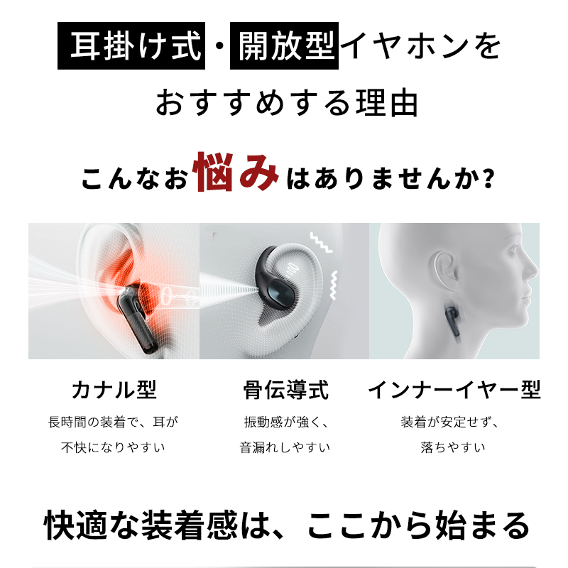 耳に直接入れないオープン型、三点支持構造の耳かけ型でしっかりフィット。長時間の使用でも痛くなりにくく、耳あたりも軽やかです。