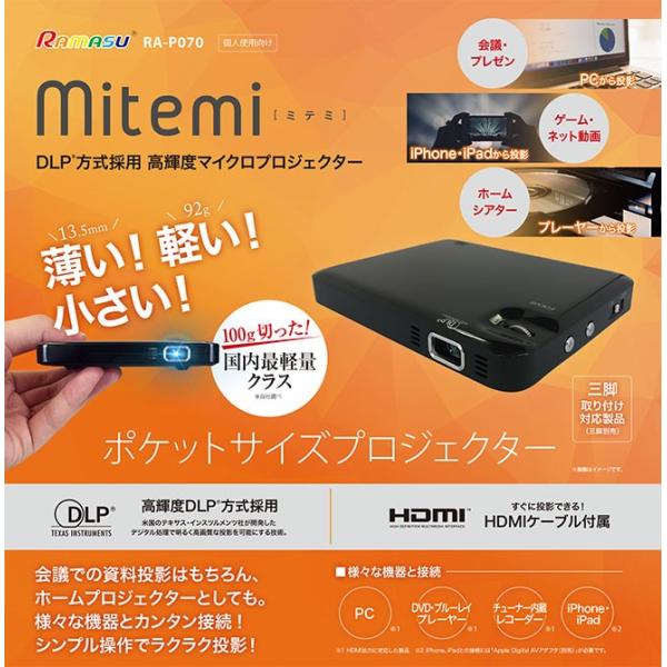 プロジェクター 小型 最軽量約92g ポケットサイズ スマホ iPhone・iPad対応 持ち運び 小型プロジェクター USB コンパクト 持ち運び DLP 高輝度 スピーカー内蔵 HDMI 軽量 映画 動画 会議 プレゼン RAMASU ラマス プロ女 女子 RA-P070 就職 お祝い プレゼント ギフト