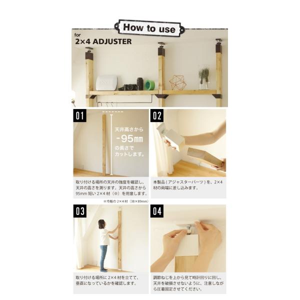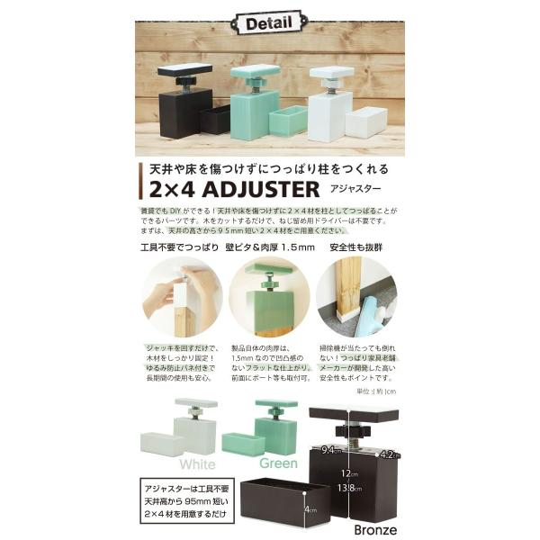 アジャスターを市販の2×4材(天井より95mm短くカットして下さい)に取り付けると、天井や床を傷つけずに木材を柱としてつっぱることができます。