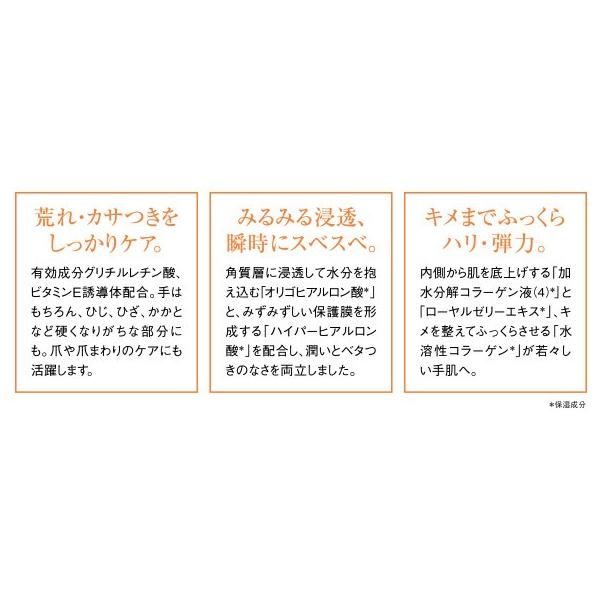 有効成分、グリチルレチン酸ステアリル、ビタミンE誘導体配合。ダメージから手肌を保護。カサつき・荒れのないなめらかな手肌へ。