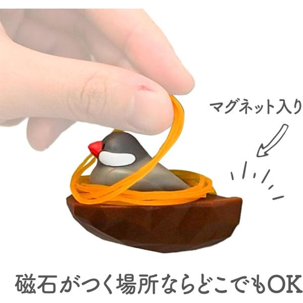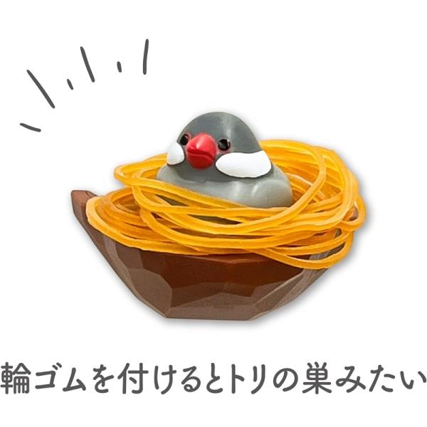 愛らしい鳥のフィギュアに輪ゴムをかけると、まるで本物の巣のような楽しい光景が広がります。