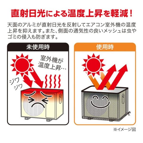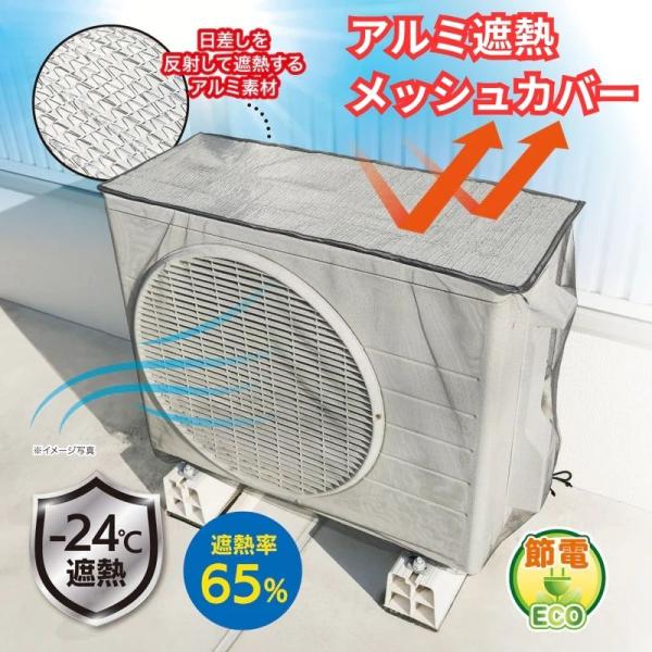 アルミの遮熱効果でエアコン室外機の直射日光による温度上昇を抑制&室外機全体をカバーするメッシュカバーで虫の侵入などを予防できるエアコン室外機カバーです。