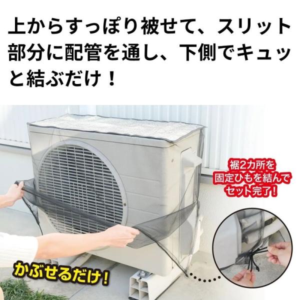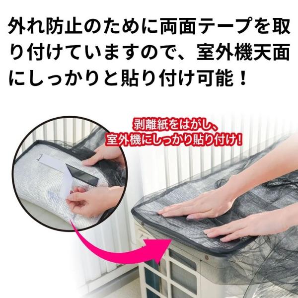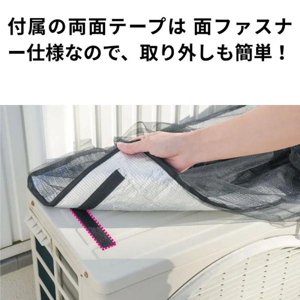 外れ防止のために面ファスナー仕様の両面テープを取り付けていますので、室外機天面にしっかりと取り付け&簡単着脱可能!