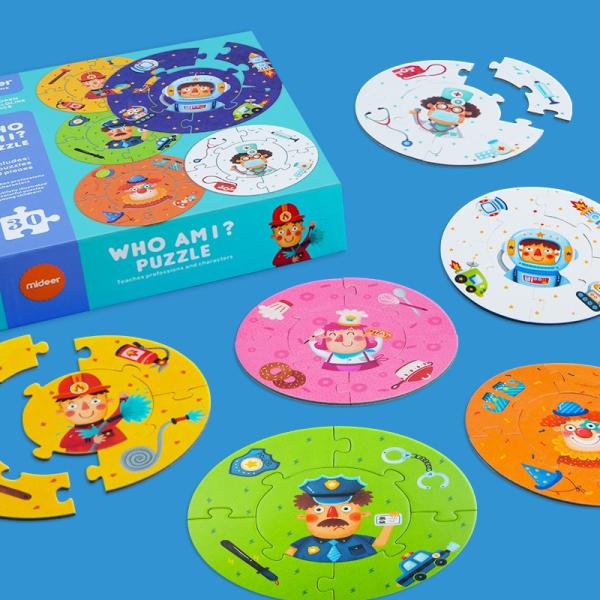 ミディアトーイ社の「フーアムアイ?パズル」は、6種類のお仕事をテーマにした知育パズルで、遊びながら自然と考える力を育てることができます。