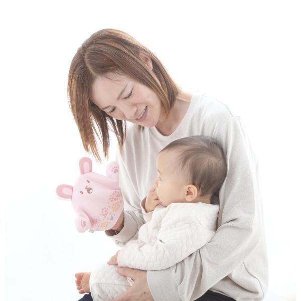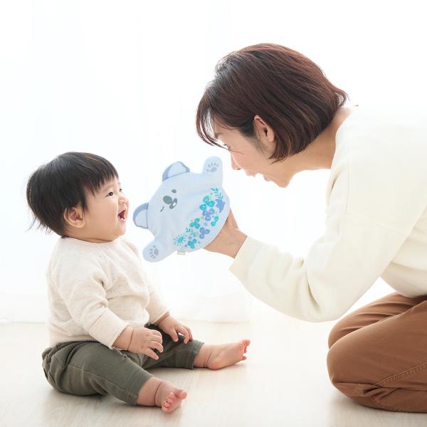 紐を外すこともでき、表と裏の表情の違いを活かした「いないいないばぁあそび」や「パペットあそび」も楽しめます。