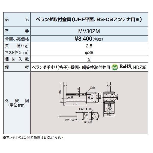 DXアンテナ 壁面取付金具(UHF平面、BS・CSアンテナ用)(MHV-135の後継品) MV30ZM