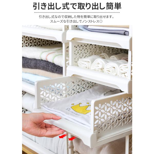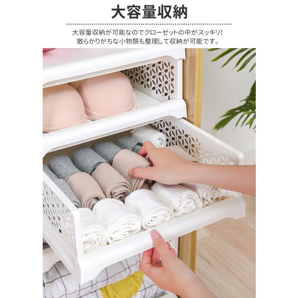 簡単に積み重ねられ、スライドはとてもスムーズなので服などが取り出しやすいです。