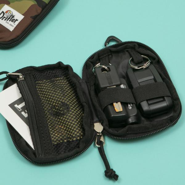 Drifter(ドリフター)より軽量で強靭な420デニールパッククロスナイロンを使用したスマートキーケースが登場。現代の必需品であるスマートキーを2つ並べて収納できる設計で、内部のラバーバンドが鍵同士の干渉や傷を防ぎます。視認性の高いメッシュファスナーポケットには小銭や鍵を、オープンポケットにはカードや4つ折りにした紙幣を収納でき、ミニマルな財布としても機能を発揮。付属のワンタッチ式カラビナでバッグやベルトループへの装着が可能です。アウトドアシーンから日常のドライブまで幅広く対応する高機能なキーアクセサリーです。