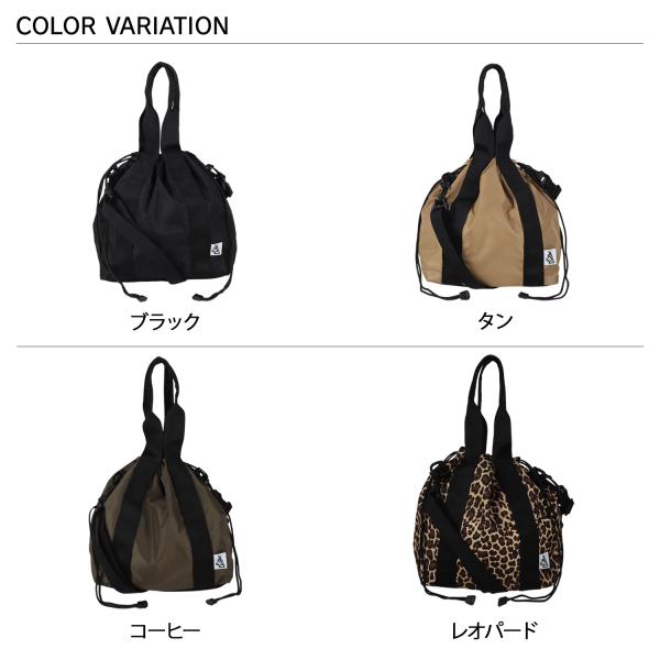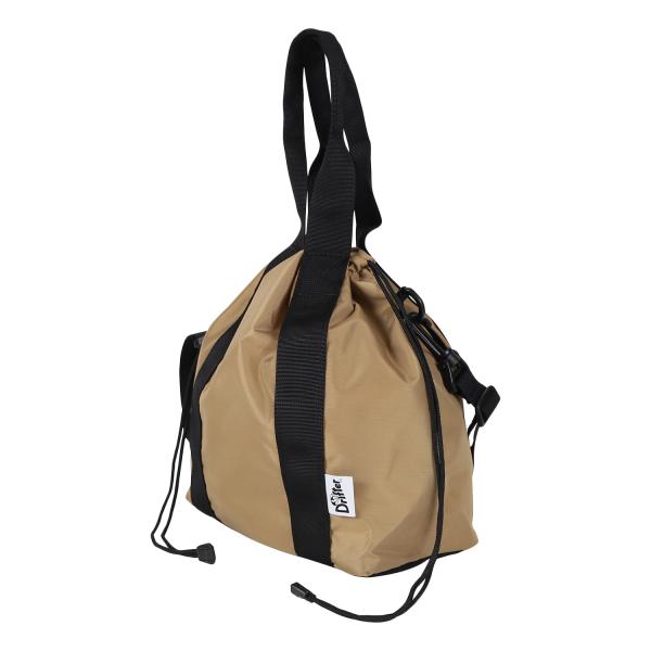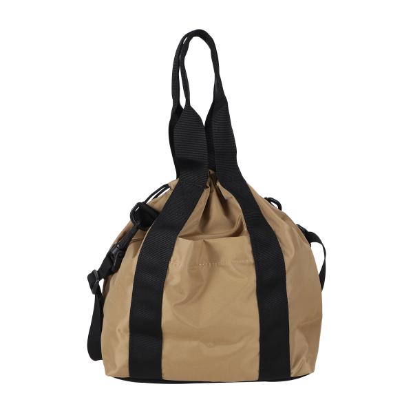 天面部分の紐を絞って巾着バッグ的な使い方も可能な2wayショルダーバッグ。背面にはスマートフォンの収納に便利なオープンポケット、内側には仕切りの役割も果たす大きなサイズのスナップボタン式オープンポケット、また小物類の分類にピッタリのオープンポケットも2ヶ所あります。ショルダーストラップは取り外し可能なのでシンプルなトートバッグの様な見た目も楽しめます。また負荷のかかりやすい底面は耐久性に優れたコーデュラナイロン素材で補強、型崩れの防止も兼ねた仕様となっています。