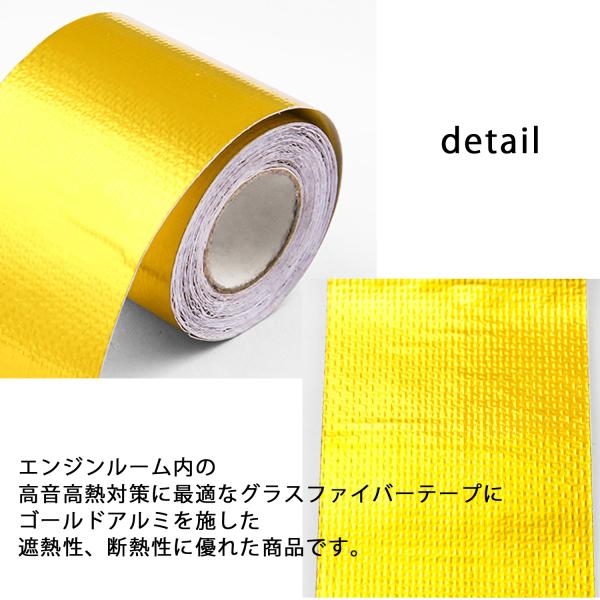 エンジンルーム内の高音高熱対策に最適なグラスファイバーテープにゴールドアルミを施した遮熱性、断熱性に優れた商品です。