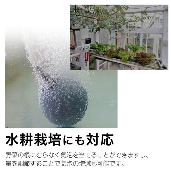水耕栽培にも対応できます。野菜の根にむらなく気泡を当てることができますし、量を調節することで気泡の増減も可能です。