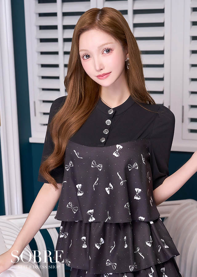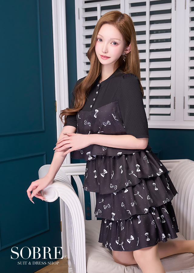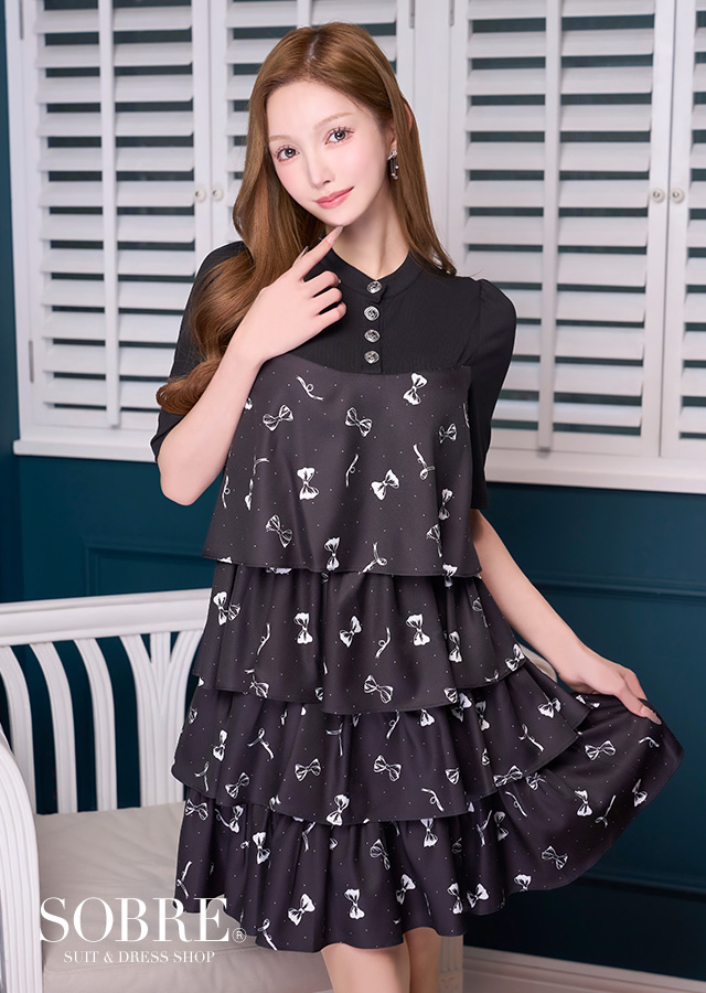リボン柄×ティアードフレアが大人可愛いワンピースドレス。