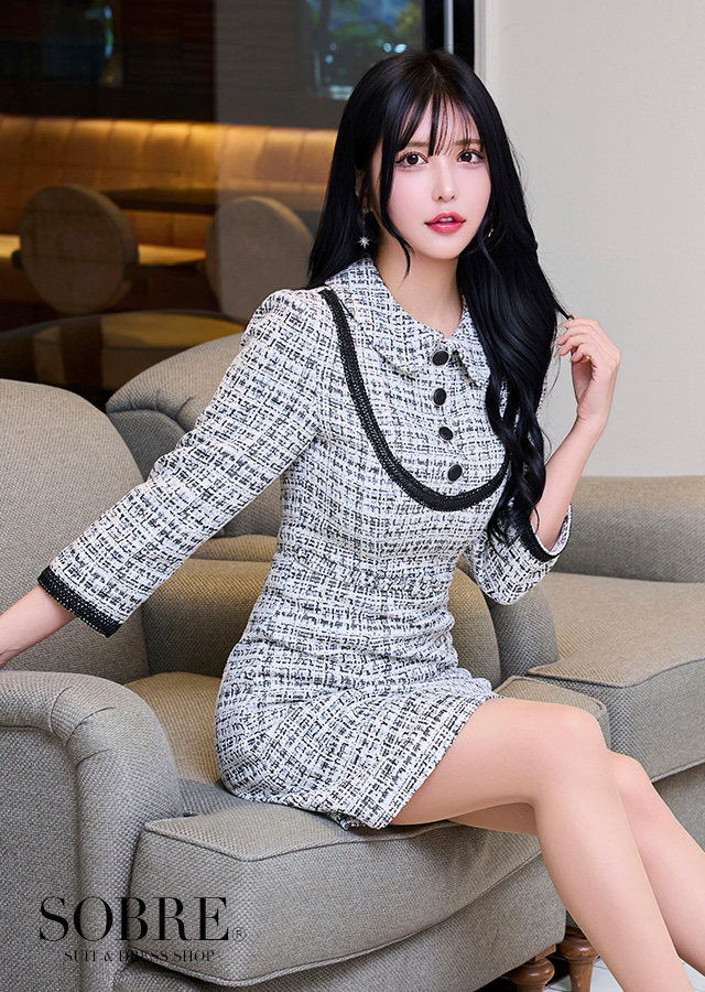 パーティードレス キャバドレス ナイトドレス 結婚式 キャバクラ 大きいサイズ 配色ブレードニットツイードワンピース