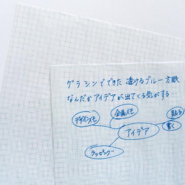 原稿用紙柄に続き、ノートでよく使われる方眼紙の柄をブルーの爽やかな色でグラシンペーパーに印刷しました。A4サイズの透けるプロジェクトペーパーとして使ったり、ラッピングなどの紙素材で使ったり、工作用紙として切ったり貼ったりしてペーパークラフトに使ってみたりと、自由にお楽しみいただけます。