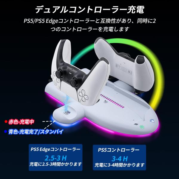 ・コントローラー充電対応: PS5 DSまたはPS5 DE Edgeコントローラーを2台同時に充電できるので、ゲームのセットアップを効率化できます。スタンドは赤いランプで充電状態を表示し、コントローラーがフル充電またはスタンバイ状態になると青色に切り替わります。この急速充電機能により、コントローラーはわずか3〜4時間でフル充電されます。