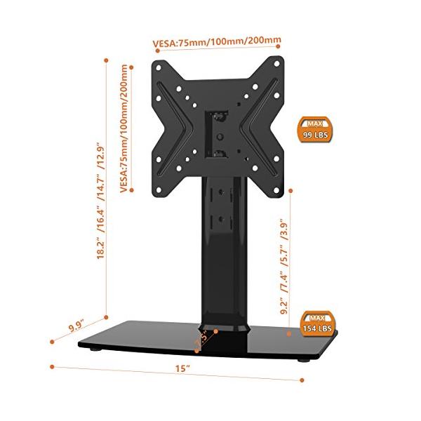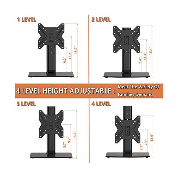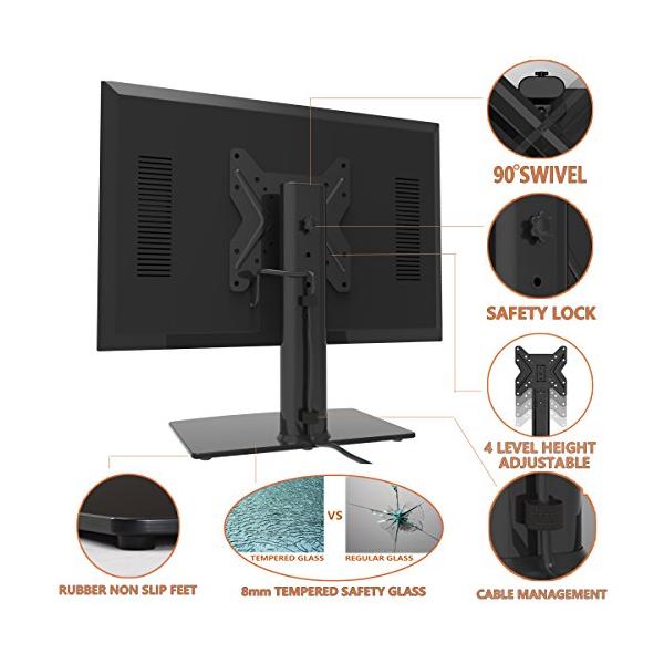 ・耐久性のある鉄製の楕円形のパネルと8mmの強化ガラスベースで設計された私の安定性フリースタンディングTVマウントは、安全性と安定性を備えたあなたのテーブルにあなたのテレビを簡単に保持できます。 75mmx75mmから200mmx200mmまで、99lbsまで保持可能
