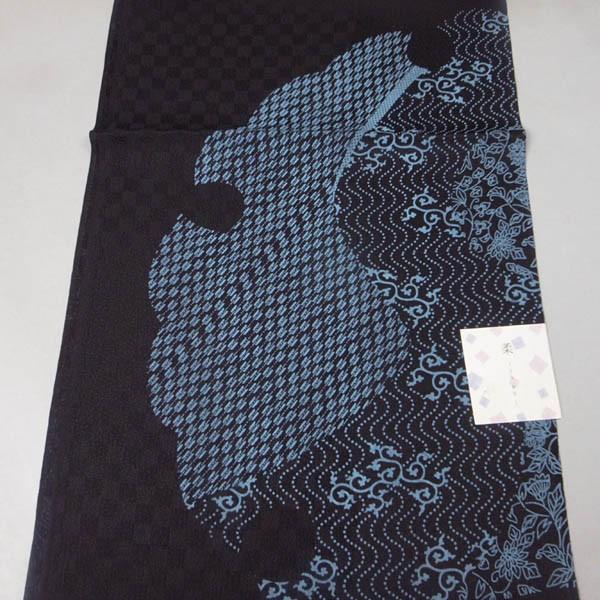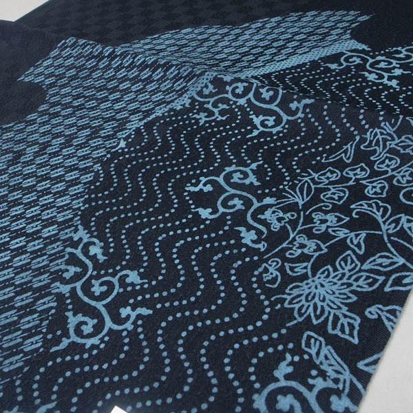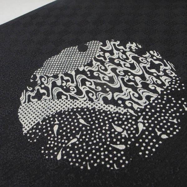 黒地にグレイッシュなブルーで江戸小紋の文様の組み合わせで大きな「雪輪」を表現しています。