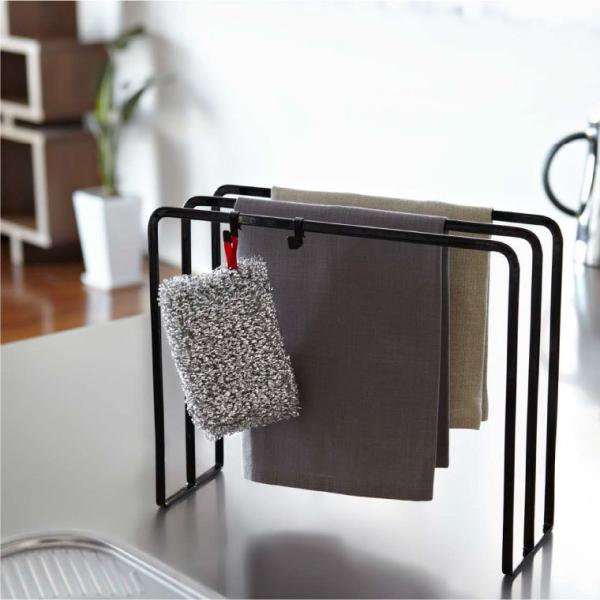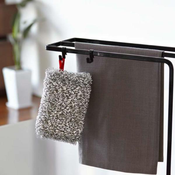 シンプルでスタイリッシュなデザインの3枚掛けの布巾ハンガー。付属品にフックが付いているので、スポンジなどの小物も干せます。
