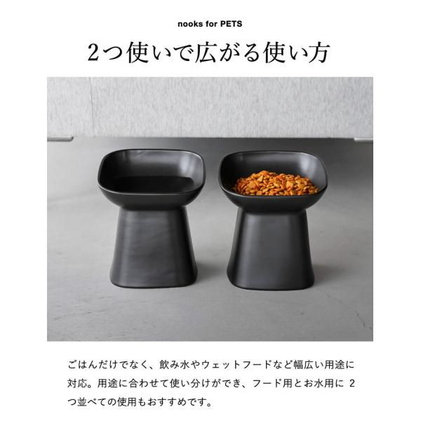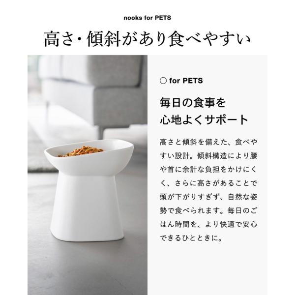 ペットの食事中の首や腰への負担をやわらげる、傾斜つきフードボウルです。傾斜つきで食べやすく、食事を快適にサポートします。ごはん・飲み水・ウェットフードなど、さまざまな用途に使用できます。愛犬・愛猫に合わせて、食べやすい高さや容量を選べます。※別売の「食べやすい高さ陶器ペットフードボウル ヌークス H8」および「食べやすい高さ陶器ペットフードボウル ヌークス 斜め H11.5」との組み合わせもおすすめです。