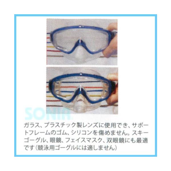 ●ガラス、プラスチック製レンズに使用でき、サポートフレームのゴム、シリコンを傷めません。スキーゴーグル、眼鏡、フェイスマスク、双眼鏡にも有効です。(競泳用ゴーグルには適しません)
