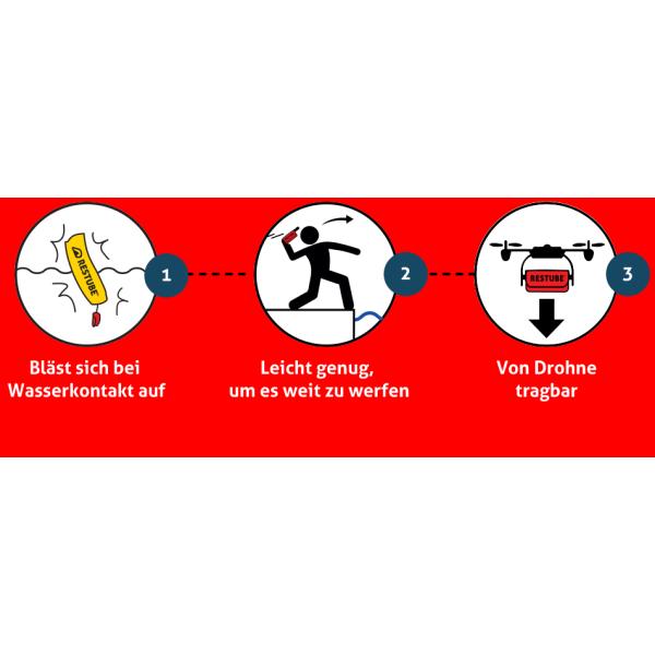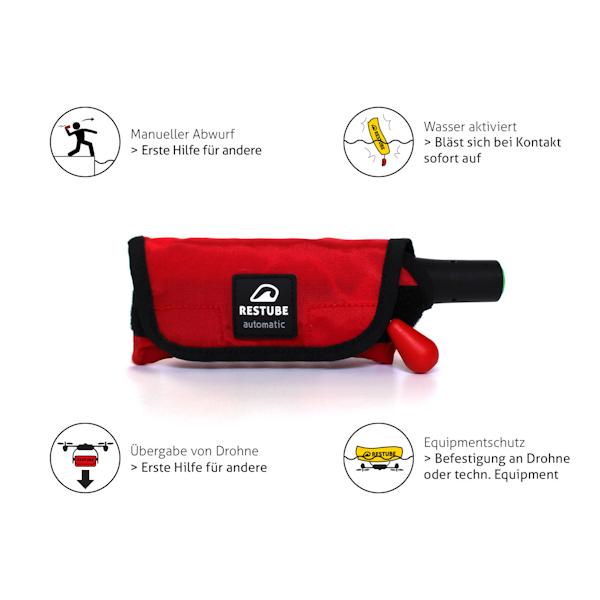 『レスチューブ』は、スイミング、サーフィン、カイト/ウインドサーフィン、ヨット、シュノーケリング、フィッシング等の、あらゆるマリンスポーツの安全バックアップデバイスです。