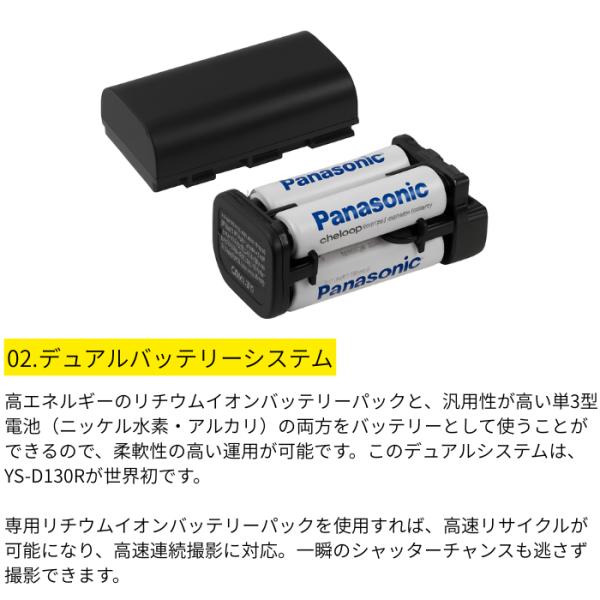 使用可能電池 :専用Li-Ion充電池 (SB-L02) / 1.5Vアルカリ単3形電池×4 / 1.2Vニッケル水素単3形電池×4