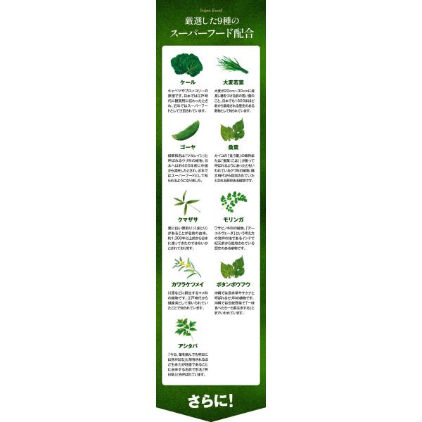 (ケール、大麦若葉、ゴーヤ、桑葉、クマザサ、モリンガ、カワラケツメイ、ボタンボウフウ、アシタバ)