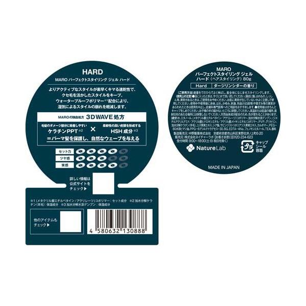 MARO パーフェクトスタイリング ジェル ハード/ヘアスタイリング剤/ブランド:マーロ(MARO)/【発売元、製造元、輸入元又は販売元】ネイチャーラボ/【MARO パーフェクトスタイリング ジェル ハードの商品詳細】★すばやくキープ HARD●アクティブなスタイルが素早くキマる速乾性で、クセ毛を活かしたスタイルをキープ。ウォータープルーフポリマー(※1)配合により、湿気によるスタイルの崩れを軽減します。●MARO×中野製薬 共同開発●パーマ髪を保護し、自然なウェーブを与える 3D WAVE処方:毛髪のダメージ部分に吸着しやすい「ケラチンPPT(※2)」×柔軟性の高い被膜を形成する「HSH成分(※3)」●セット力 ★★★★/ツヤ感 ★★★/束感 ★★★★●ダージリンシダーの香り※1 (メタクリル酸エチルベタイン/アクリレーツ)コポリマー(セット成分) ※2 加水分解ケラチン(羊毛) (保湿成分) ※3 加水分解水添デンプン(保湿成分)※パッケージデザイン等は予告なく変更されることがあります【販売名】MARO パーフェクトスタイリング ジェル ハード/cate35255