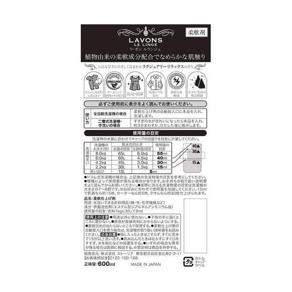 ラボン 柔軟剤 ラグジュアリーリラックス(LAVONS LE LINGE ラボン ルランジェ)/柔軟剤/ブランド:ラボン(LAVONS)/( 花粉吸着防止 )/【発売元、製造元、輸入元又は販売元】ネイチャーラボ/【ラボン 柔軟剤 ラグジュアリーリラックスの商品詳細】●パルファムの香りに包まれる柔軟剤●洋服や身の回りのファブリックを美しくするための、イノセントな女性をイメージした香りの柔軟剤です。●天然由来の香料を配合し、香水のようなラグジュアリーな香りの仕上がりを目指します。●スキンケア発想で肌ケア成分を配合し、赤ちゃん用衣類にも使えるやさしさです。●衣類をふんわりやわらかく、なめらかな肌触りに仕上げます。また、静電気の発生を抑え、衣類のまとわりつきや花粉の付着を防ぎます。●衣類を抗菌・防臭。イヤなニオイのもととなる雑菌の繁殖を抑えます。●ラグジュアリーリラックス・心落ち着く、上品な甘さにやさしく包まれるフローラルフルーティの香り・トップ:ガーデニア/ミドル:ローズ・ミュゲ・バニラ・ジャスミン・バイオレット/ラスト:ウッディー・アンバー・ムスク●植物由来の柔軟成分。性.../cate70021