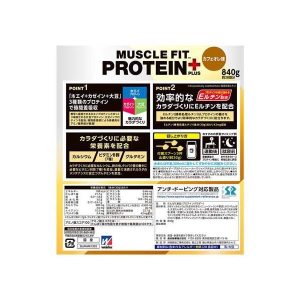 ウイダー マッスルフィットプロテインプラス カフェオレ味/プロテイン/ブランド:ウイダー(Weider)/( 森永 タンパク質 ホエイ カゼイン 筋トレ ウイダー )/【発売元、製造元、輸入元又は販売元】森永製菓(ウイダー製品)/【ウイダー マッスルフィットプロテインプラス カフェオレ味の商品詳細】●「ウイダー マッスルフィットプロテインプラス」は、運動をする方の効率的な筋力アップと栄養補給を支えるプロテインです。●素早く吸収されるホエイプロテインと、ゆっくり持続的に吸収されるカゼインプロテインが時間差で効果を発揮、「プラス」だけに追加された植物性タンパク質のソイプロテインが健康維持にも役立ちます。カルシウム、鉄分のほか体のメンテナンスに役立つグルタミン、タンパク質の働きに必要なビタミンB群(7種)を添加。/cate05029