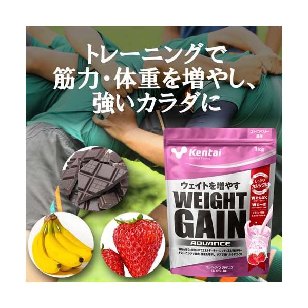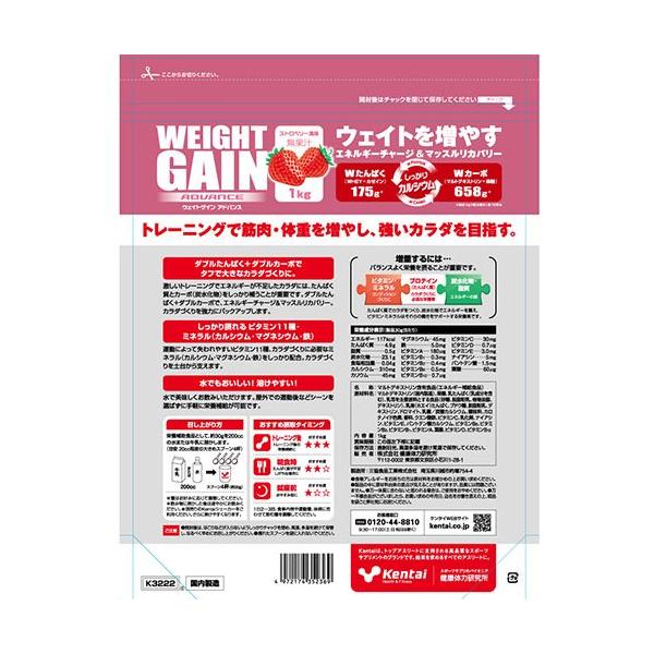 Kentai(ケンタイ) ウェイトゲインアドバンス ストロベリー風味(ウエイトゲイン kentai)/プロテイン/ブランド:kentai(ケンタイ)/( 栄養補給 筋肉 体重 カラダ カーボ ストロベリー )/【発売元、製造元、輸入元又は販売元】健康体力研究所/【Kentai(ケンタイ) ウェイトゲインアドバンス ストロベリー風味の商品詳細】●競技アスリートにとって増量は重要な課題であり、そのための栄養摂取もトレーニング同様に重要です。●ウェイトゲインアドバンスは、真剣に増量を目指すアスリートのカラダづくりをしっかり支えるマルチ栄養食です。●激しいトレーニングでエネルギーが枯渇したカラダには、たんぱく質と炭水化物を的確に補うことが重要です。●ダブルタンパク(ホエイ・カゼイン)、ダブルカーボ(マルトデキストリン・果糖)を採用。●ビタミン11種、ミネラル(Ca、Mg、鉄)を配合。●水にさらりと溶け、手軽に栄養補給できます。●水でもおいしいストロベリー風味。/cate05029