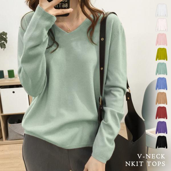 ニットトップス レディース 秋 冬 秋冬 白 Vネック サマーニット セーター トップス 長袖 ゆったり ホワイト イエロー グリーン 無地 20代 30代 母 送料無料