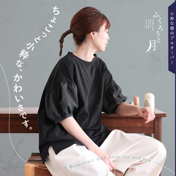 【ついに再入荷!】 ふくろうと月 小粋な襟のプルオーバー レディース カットソー Tシャツ 5分袖 パフスリーブ バルーンスリーブ トップス 母の日 プレゼント
