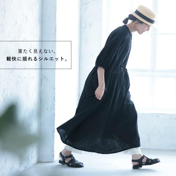 なつくろワンピース レディース ロング フレア Aライン 五分袖 5分袖 半袖 リネン混 麻混 ピンタック 母の日 プレゼント ギフト 贈り物