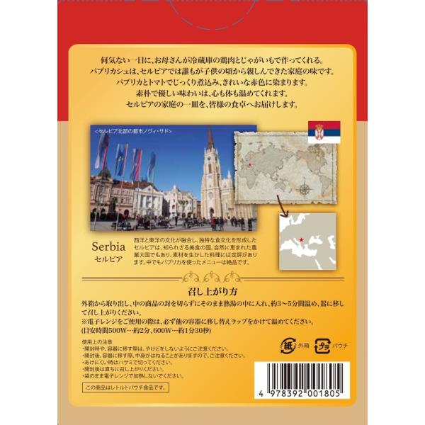 何気ない一日に、お母さんが冷蔵庫の鶏肉とじゃがいもで作ってくれる。パプリカシュは、セルビアでは誰もが子供の頃から親しんできた家庭の味です。 パプリカとトマトでじっくり煮込み、きれいな赤色に染まります。素朴で優しい味わいは、心も体も温めてくれます。セルビアの家庭の一皿を、皆様の食卓へお届けします。