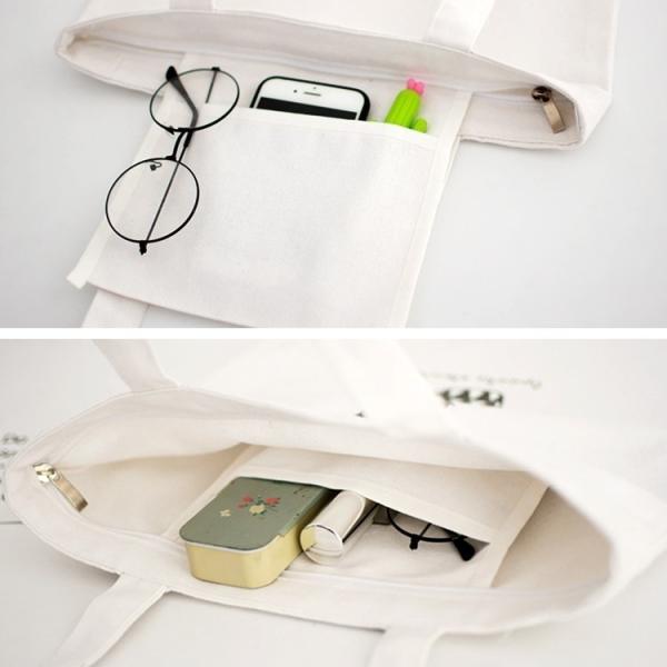 シンプルなデザインで、天面ファスナー付き、中に小さいポケットも1つあり、収納力のある丈夫なキャンバスバッグです。