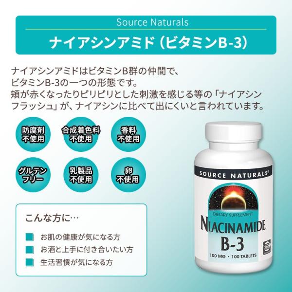 ソースナチュラルズ ナイアシンアミド ビタミンB-3 100mg 100粒 タブレット Source Naturals Niacinamide Vitamin B-3 Tablets フラッシュフリー