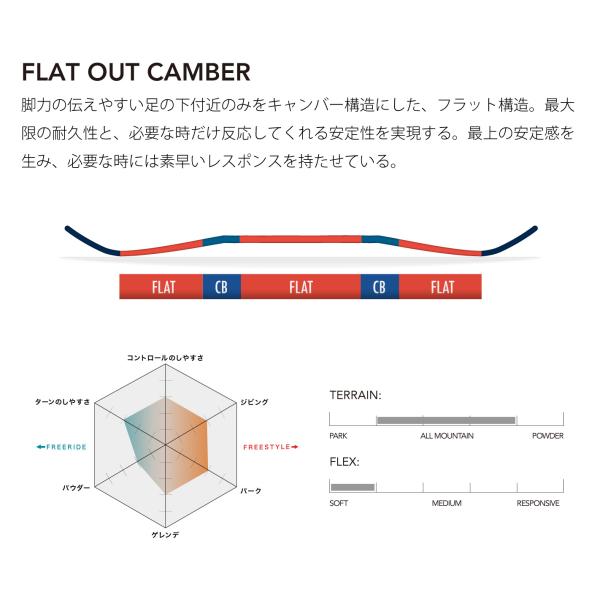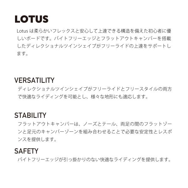 LOTUSは柔らかいフレックスと優しい構造で初心者でも安心して上達できるよう負担を軽減します。ディレクショナルツインシェイプでバイトフリーエッジを搭載しているのでエッジの引っ掛かりのない快適なライディングが可能です。
