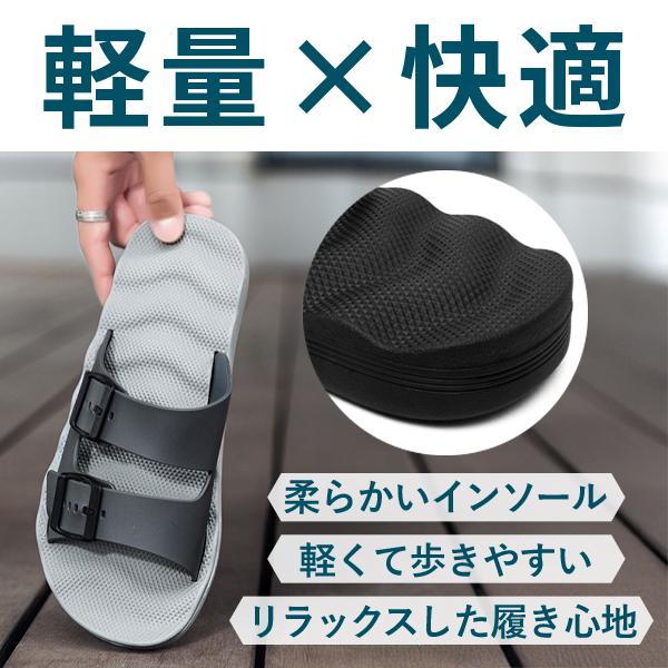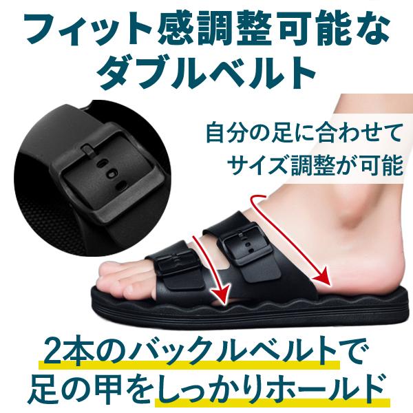 スタイリッシュなブラックカラーとダブルベルトデザインが特徴のメンズサンダル。