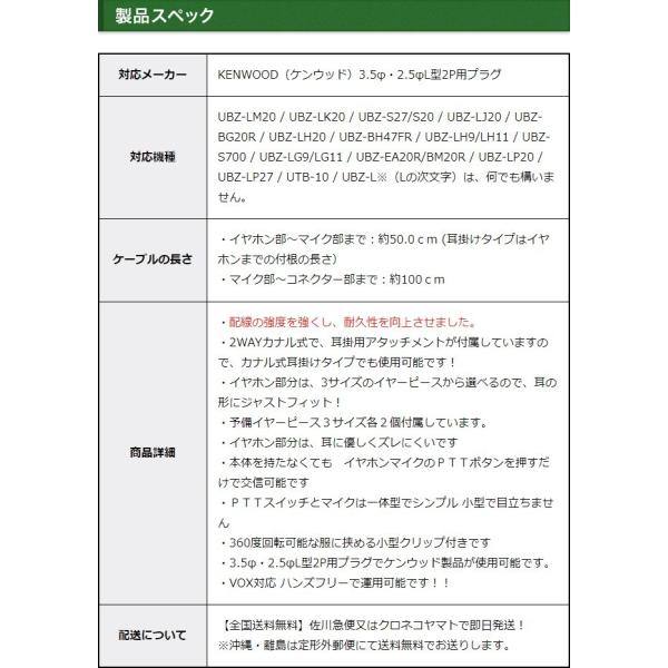 ケンウッド用 イヤホンマイク 2ピン デミトス用 UBZ-LP20 UBZ-LS20 UBZ-LM20 UBZ-LK20 UTB-10などに対応 ショートケーブル 耳掛け式 EMC-3 EMC-12互換 FAMZKM