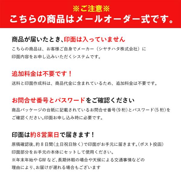 【メールオーダー式】なので、本体だけが先に届きます。はんこの部分は、その後ハガキかWEBから、印面部をメーカー(シヤチハタ株式会社)にお申し込みください。はんこ部分の作成料や送料は含まれています。