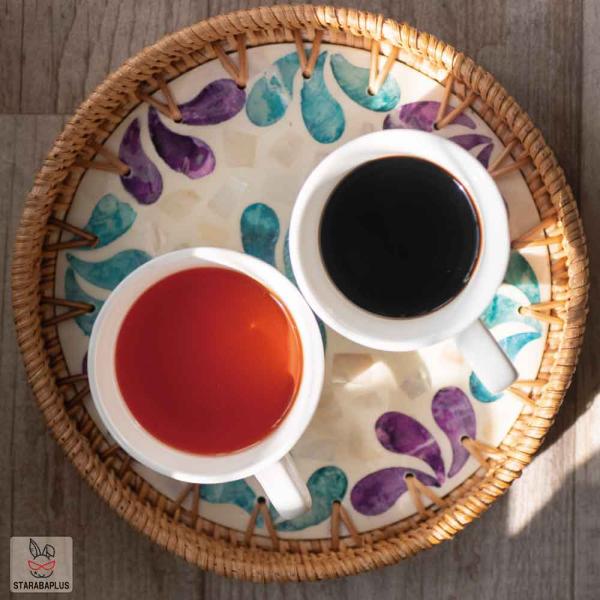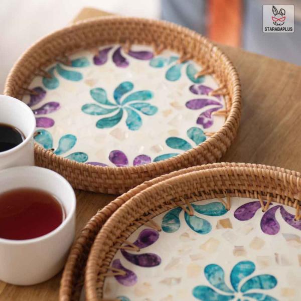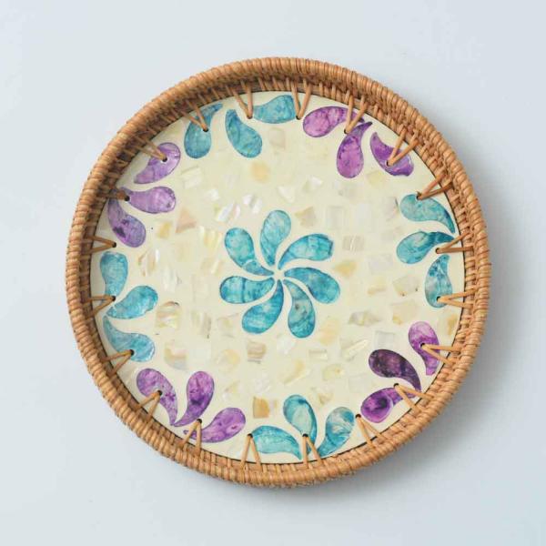 ベトナムのラタンと選ばれた貝殻を組み合わせ、ベトナムの職人によって手編みされ、貝殻で装飾されたトレーです。