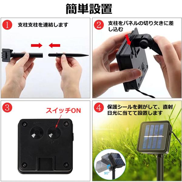 バッテリーや家庭用電気が一切不要、電源スイッチをオンにして直射日光に当てるだけで太陽エネルギーを電気に変換します。夜間などパネルの周りが暗くなるとソーラーライトが自動的に点灯します。