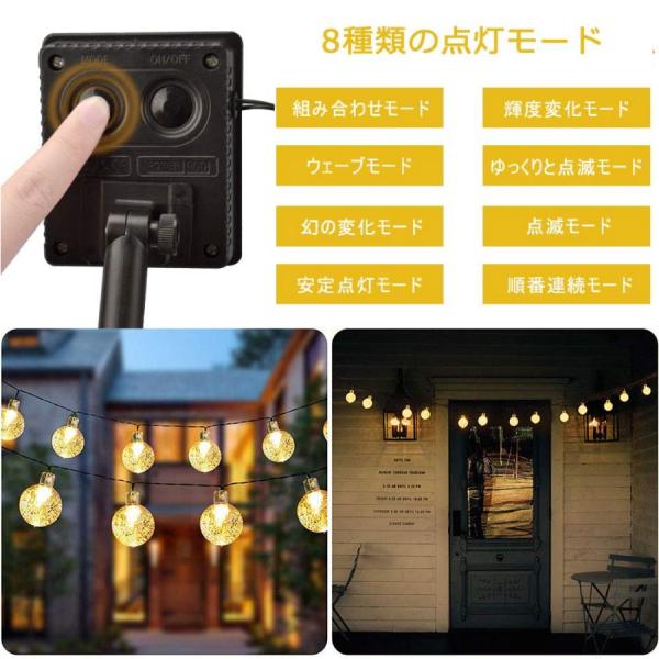 ウォームカラーの飾りライトでロマンチックかつ癒しの雰囲気を作り出せます。他に雰囲気に合わせて常時点灯や点滅など全8つの点灯パターンを設定できるソーラーLEDフェアリーライトです。