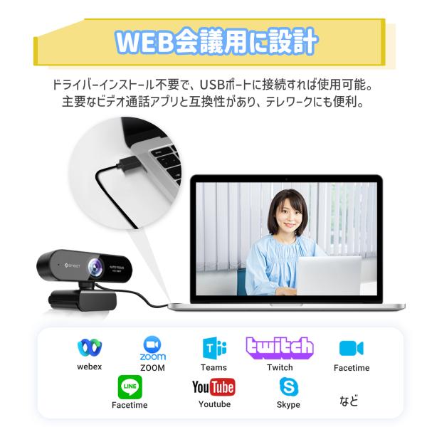 このウェブカメラは1080pの高解像度で鮮明で滑らかな映像を提供し、200万画素で撮影が可能です。96°広角のレンズを使用しており、他のUSBウェブカメラよりも、多数の参加者がいるオンライン会議でも適切な角度で画面を歪ませずに撮影することができます。レンズは4層の高性能光学を備えており、薄暗い室内でもクリアな映像を送信する自動低照度調整機能が付いています。また、色調や露出の補正にも優れています。