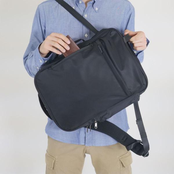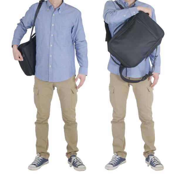 荷物を下に降ろさなくても、肩に掛けたまま体の前にスライドさせることで中身を取り出しやすい構造に。片方の肩にかけて荷物の出し入れが出来ます。又、手持ちの際にハーネスが地面につかないように、ハーネスを一時収納するポケットを背面に配置。