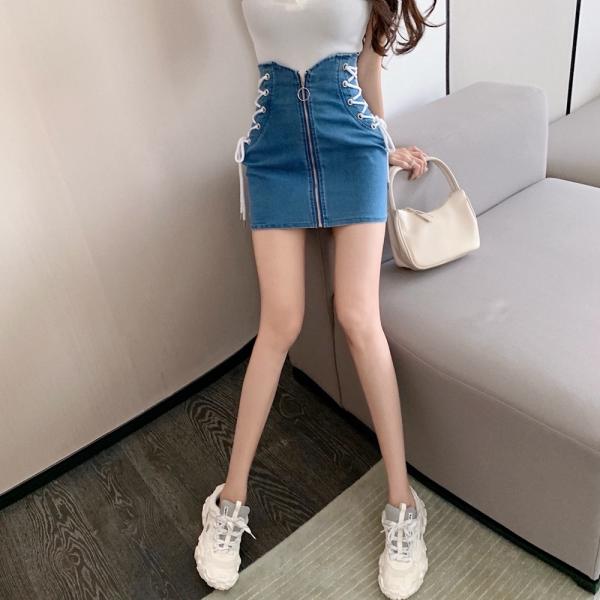 即納 サイド レースアップ スタイリッシュ フロントジップ タイト デニム ミニスカート ボトムス