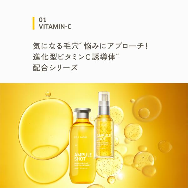 キレイの成分をつめ込んだ、成分特化型スキンケア「アンプルショット」の美容液。進化型ビタミンC誘導体*1をはじめ、水溶性ビタミンC誘導体*2とピュアビタミンC*3を高濃度*4に配合。さらに美容液成分が凝縮された黄色のカプセル入りで、エイジングケア*5も同時に叶えます。乾燥によるくすみやキメの乱れを整えて、内側からしっとりと柔らかな肌へと導きます。