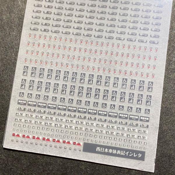 221系や115系、キハ40等の半自動スイッチ案内ステッカー、特急車用乗務員室、業務用室等西日本車両の車体表記各種を収録したNゲージ(1/150スケール)用のインレタです。
