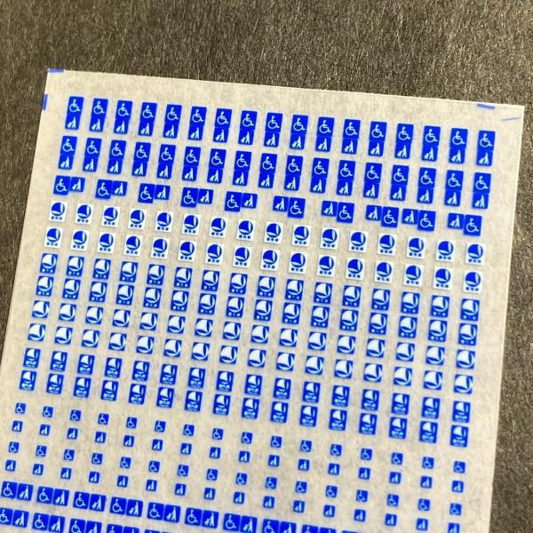 車椅子表記とベビーカーマークを収録したNゲージ(1/150スケール)用インレタです。主に京急などで使われるタイプを収録。下の方に東急とJRタイプも。先頭車が2両並んだ写真は上が製品状態、下がインレタ貼り付け状態です。車椅子マークもインレタになってます。
